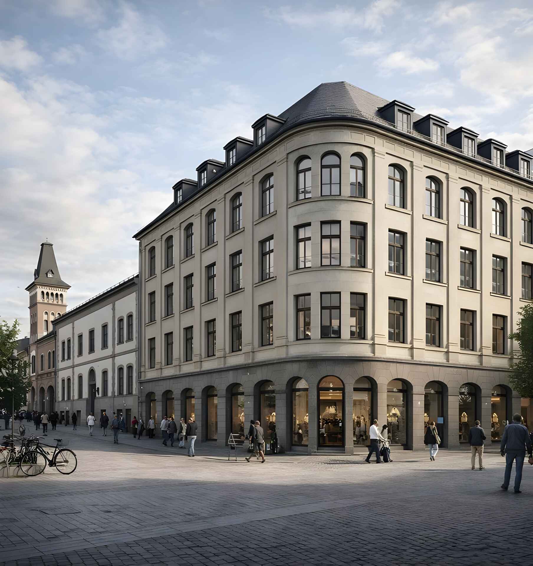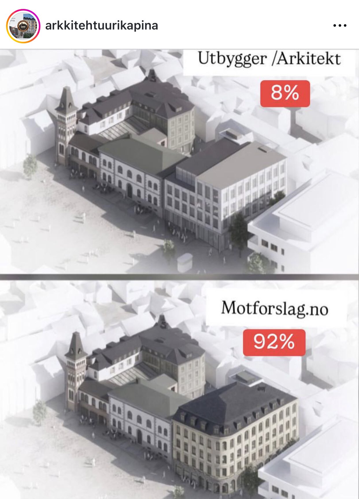 E abaixo, a cidade de Tønsberg, na Noruega, planejava construir um novo edifício modernista na praça principal, mas uma contraproposta foi apresentada e, segundo o jornal local, após 5.000 votações, o resultado foi expressivo — com 92% dos votos — a favor da arquitetura clássica em harmonia com a arquitetura existente da cidade.